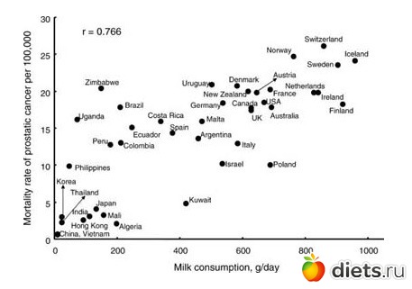 (на графике смертность от рака простаты на 100 000 чел против количества потребляемого молока г/день)