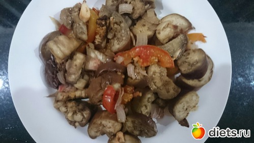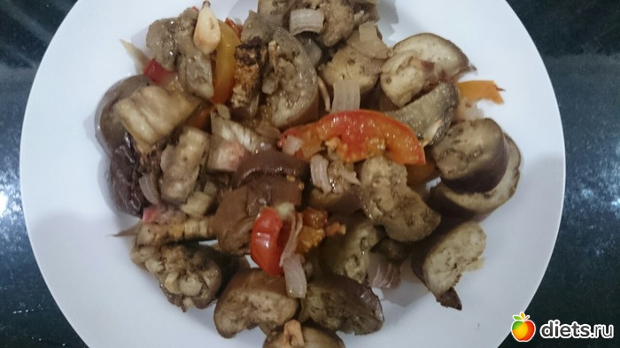 Ужин - запекла в духовке баклажаны с помидорками, луком и чесноком..