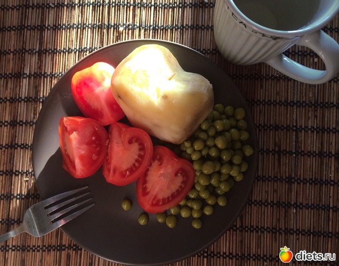 Завтрак - вареный картофель, помидор, горошек.