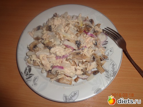 На обед захотелось чего-то прикольного, а то простая еда может и надоесть такими темпами. Соорудила салат "Из того, что было" - вареная грудка, отварной кальмар, грибы шампиньоны, синий салатный лук. Заправила йогуртом, а потом взяли и плюхнула туда ложку майонеза. Получилось обалденно