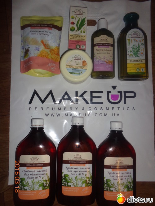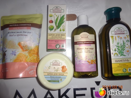 Шампунь, тоник, крем для лица и для век, 3 штуки моего любимого сбора для ванн (муж с сыном тож подсели на эту прЭлесть), мыло получила в подарок от сайта, приятно...