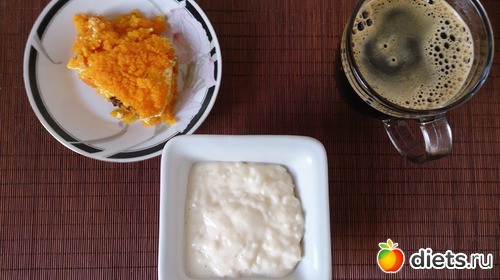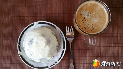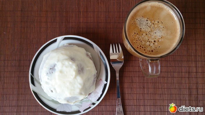 Что-то отвлеклась, итак на завтрак был кейк из льняной муки с пп-сгущенкой и кофе с молоком
