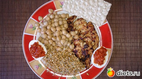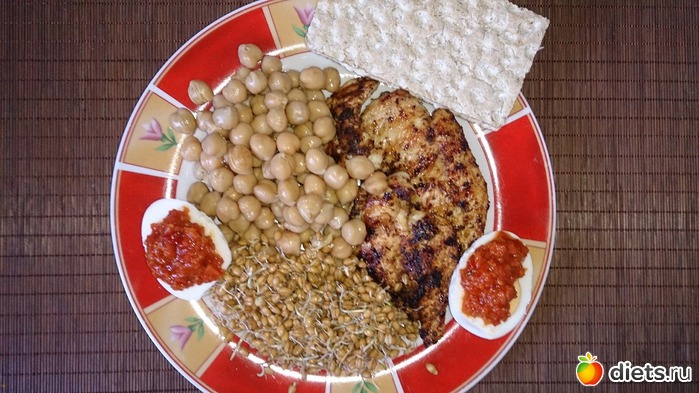 Обед был практически под вечер и на скорую руку: филе куриное, нут, пророщенная пшеница, яйцо вареное с аджикой, хлебцы с сыром