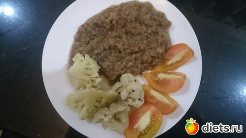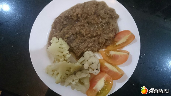 Ужин: запеченые в духовке баклажаны взбила в блендере получилась икра, немного цв.капусты и помидорка..