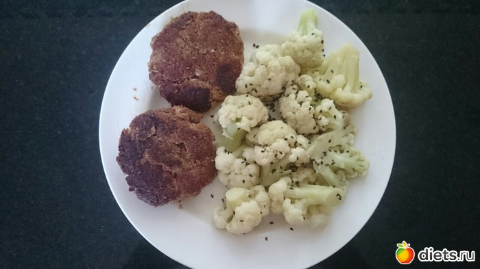 Сегодня у меня мясной день. Сделала котлетки чисто из мясного фарша и специй, обваляла их в отрубях. На гарнир сварила цветную капусту.
