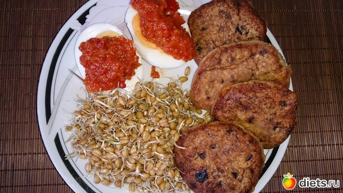 Обед был очень поздний, после прогулки уже, практически ужин так сказать, поэтому на скорую руку куриные котлетки с нутом, пшеница пророщенная, яйцо с аджикой и пара хлебцов