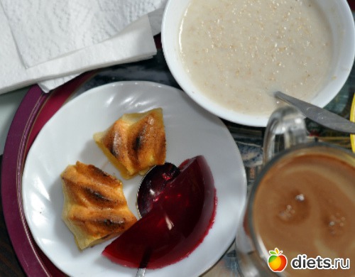 Кофе с молоком 1,5%, пара кусков вчерашней запеканки с ужина, и остаток конфитюра из каркаде на фитпараде.