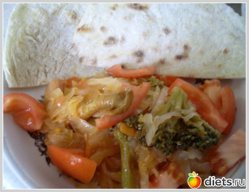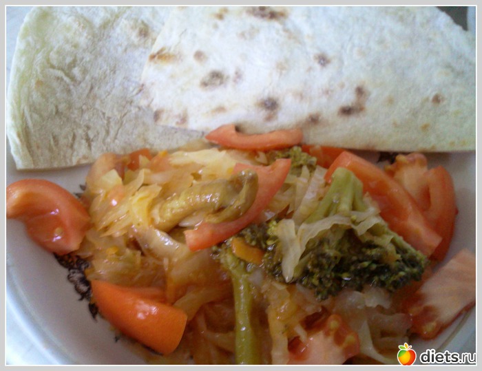 О- лепешки - чапати ( индийские) + овощи тушеные ( грибы+ кв. капуста+ капуста броколли+ лук + свежая помидорка добавлена после тушения)+ кофе