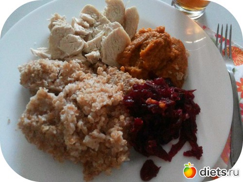 Обед: пшеничная каша + кабачковая икра + свекла с черносливом + курогрудка и 200мл яблочного сока для деток