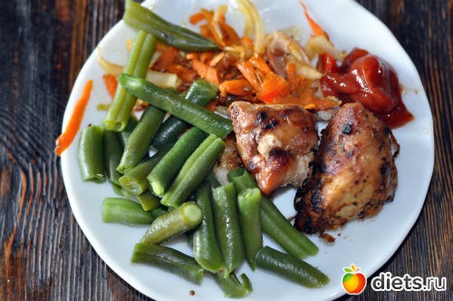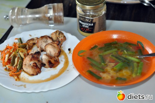 Щи из капусты, перца консервированного и зеленой фасоли (домашние заготовки), доедаю вчерашний шашлык, ложка овощного салата.