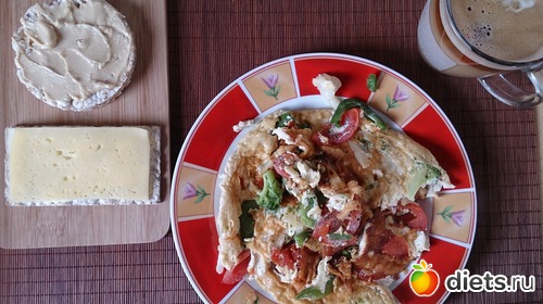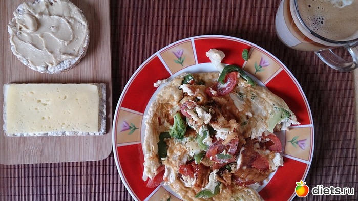 Да-да, без кейка))) Омлет с овощами, хлебец со сливочным маслом и сыром, хлебец с арахисовым муссом и кофе с молоком.