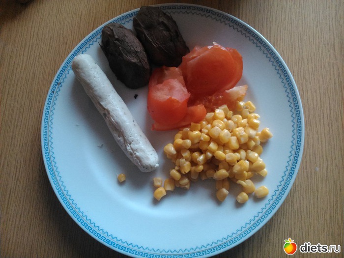 Кукуруза, помидорка, запеченная на костре картошечка и целых 3 сосиски (я их сама приготовила из куриной грудки)...