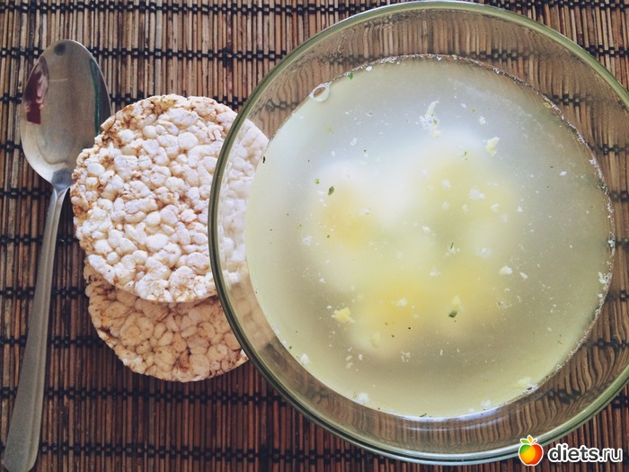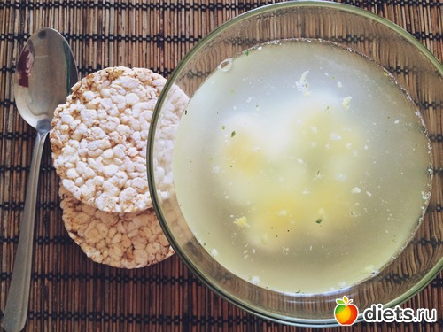 Утро я начала с куриного бульончика с яйцом и хлебцев.