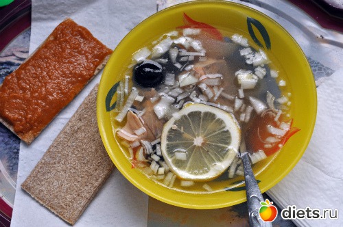Обэд: Уха из горбуши (горбуша, лук, специи. но горбуша была совсем уж постная, я решила добавить пару маслин), пара хлебцов, один с остатком икры ( две ложки).
