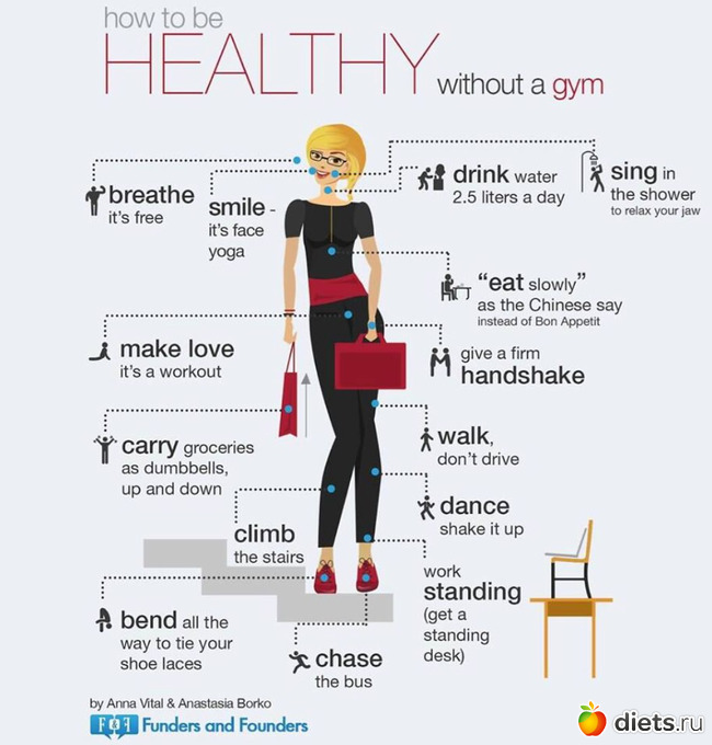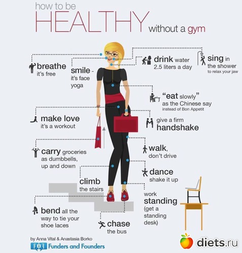 Дыши, улыбайся, пей воду, пой под душем, занимайся сексом, ходи пешком, пользуйся ступеньками, танцуй, пробегись, пытаясь успеть на автобус, наклоняйся, завязывая шнурки-оставайся здоровой без фитнес-центра!:-) Читать полностью
