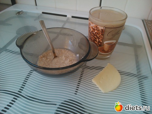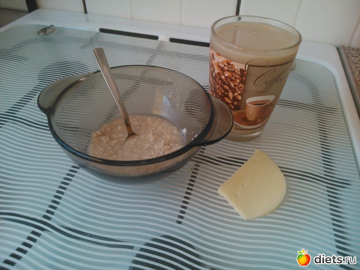 Завтрак - каша, кофе с молоком, ломтик сыра...