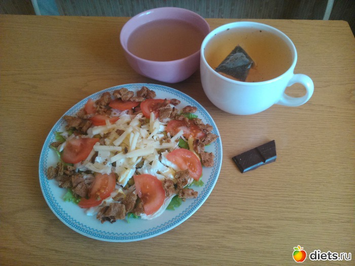 Обед - куриный бульон, салат - листья салата, куриная грудка, 1 яйцо, сыр, помидор, сухарики из хлебца (разломила хлебец на мелкие кусочки, слегка сбрызнула водой, посыпала специями и поставила в микроволновку чтобы подсохли), заправила натуральным йогуртом и соевым соусом; зеленый чай, долька шоколада... Читать полностью