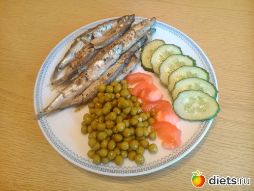 Ужин - мойва, зеленый горошек, помидор, огурец, 1\2 банана и чай..