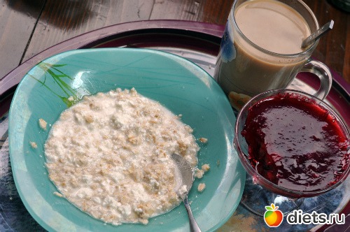 2 ложки овсянки (залила кипятком), позже добавила обезжиренный 0,5% творог и вкуснейший конфитюр из вишни на агаре. Кофе с молоком 1,5%