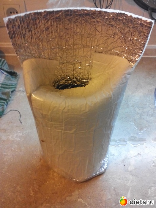 И ставлю баночку вот в такой термос собственного изготовления. (Делали балкон, остался кусок утеплителя, решила сделать временный термос)