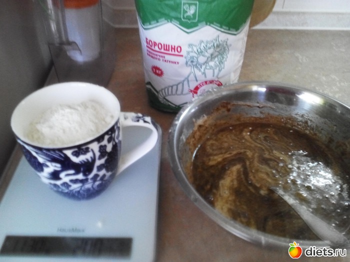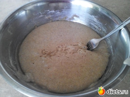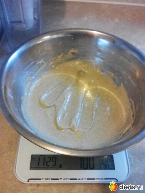 заливаю кипятком, по консистенции должно получиться жиденько, примерно так, на вилке масса не задерживается.