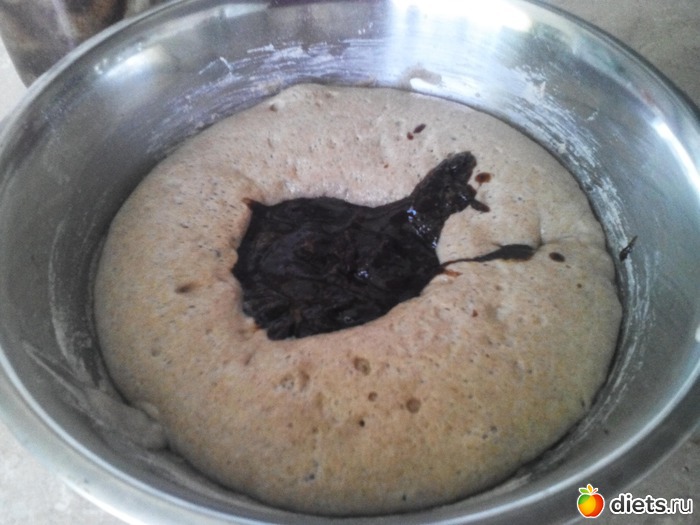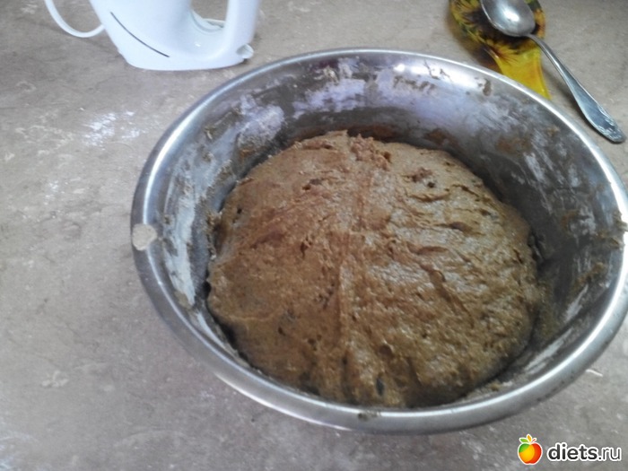 Добавляю примерно 200 грамм ржаной муки( когда как, начинаю добавлять со 150грамм) тесто должно не плыть или плыть, но очень медленно. Проверка на "заплыв" теста, обминаю мокрой ложкой в полу колобок и смотрю на него, если быстро плывет добавляю ржаной муки.