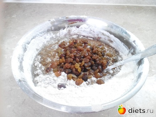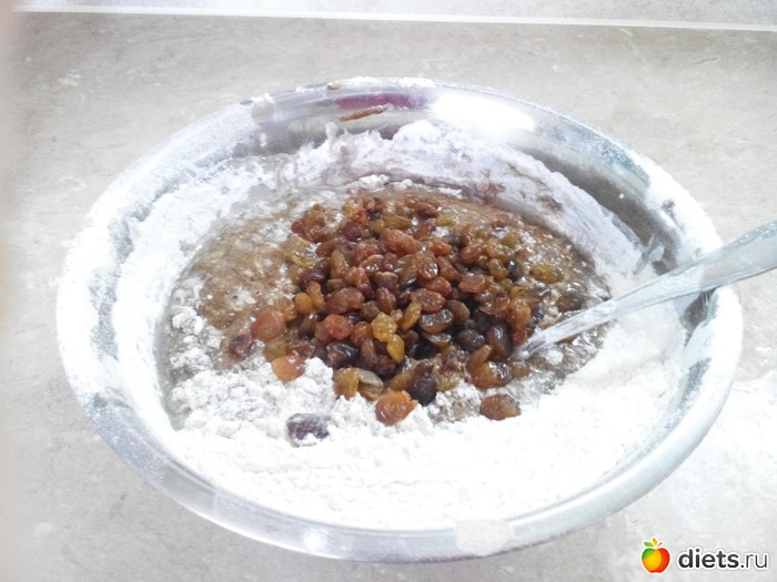 Также в опару добавляю изюм и 200 грамм пшеничной просеяной муки. (если есть дома чищеные семечки подсолнуха тоже их туда бросаю)