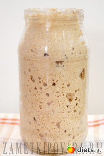В литровую баночку смешиваю 50мл воды и 50 грамм ржаной муки, накрываю полотеничком оставляю на 24 часа. Через 24 часа добавляю 50 мл воды и 50 грамм муки ржаной. И так 5 раз. Масса в баночке будет через пару дней бродить и пузыриться. Если не хватало места, половину массы выбрасывала. Баночка стояла на столе на кухне, специально я ее не подогревала и никаких манипуляций другого плана не производила. Вот так в конечном итоге выглядела моя закваска. Фото из интернета.
