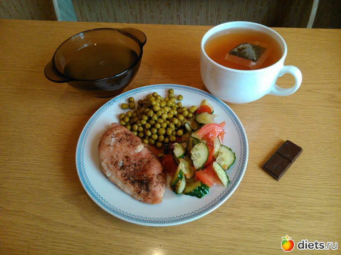 Обед - пастрома из куриной грудки, зеленый горошек, салат из помидор и огурцов (заправила маслом и соевым соусом), куриный бульон, чай, долька темного шоколада..