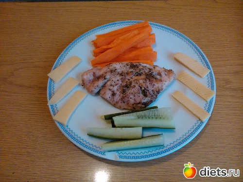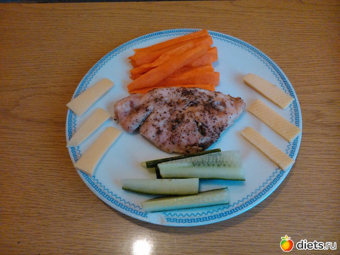 Ужин - пастрома из куриной грудки, морковь, огурец, немного сыра..