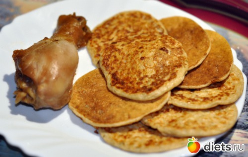 Отрубные оладьи на кефире и куроножка в соусе терияки)) но без шкуры и без соуса.