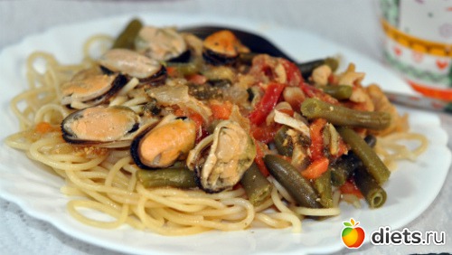 Завтрак: На радостях я решила доесть оставшиеся в небольшом количестве спагетти из цельнозерновой пшеницы, добавив остаток же овощей, и несколько мидий.