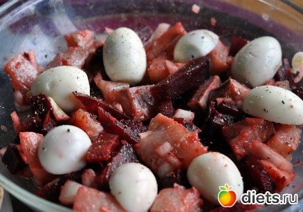 Но пока всё готовится, я быренько соорудила перекус, утилизируя остатки еды: около 120гр. сельди, печёная свёкла и перепелиные яйки.