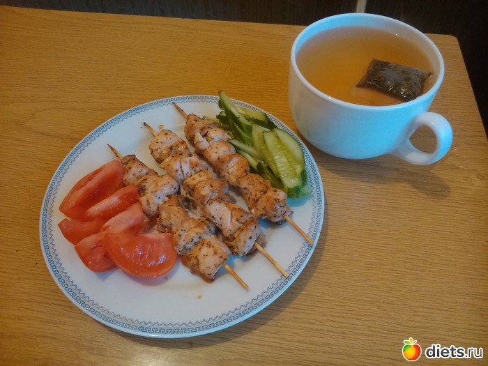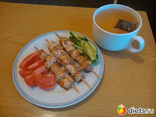 Ужин - шашлычки из куриной грудки, 1\2 огурца, 1\2 помидора и чай...