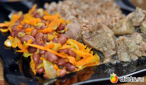 Индейка тушёная, 107 гр. гречка отварная 70 гр., салат из фасоли (овощи слегка припущены с оливк. маслом) + зеленый чай.