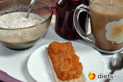 Каша из овсяных хлопьев + 50 мл. молока 2,5%, кофе + 30 мл. молока 2,5%, хлебец и 70 гр. икры кабачковой.