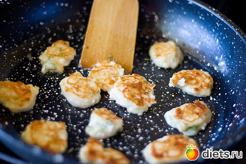 Все тщательно перемешать. При помощи двух чайных ложек выкладывать массу на разогретую сковороду с оливковым маслом и жарить на маленьком огне в течение 2-3 минут с каждой стороны (до готовности).