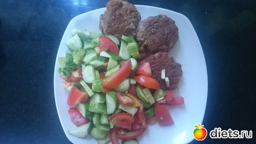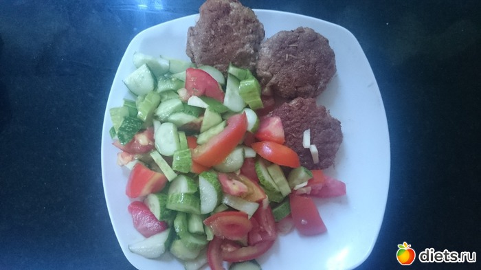 Сегодня мясной день. Сделала котлетки (мясо и лук, обваляла в отрубях)и салатик..