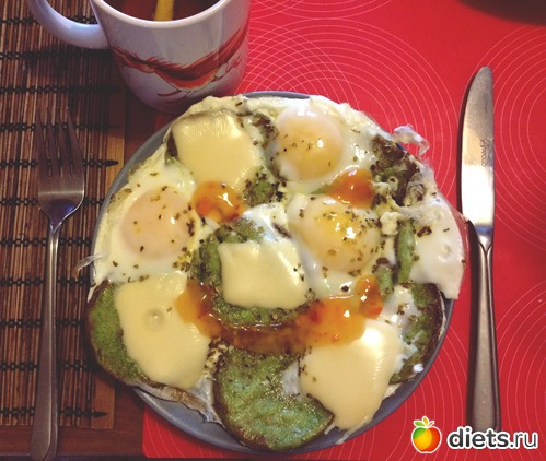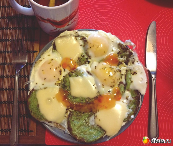 Завтрак - 5 шпинатных оладушек с 3 яйцами под сыром