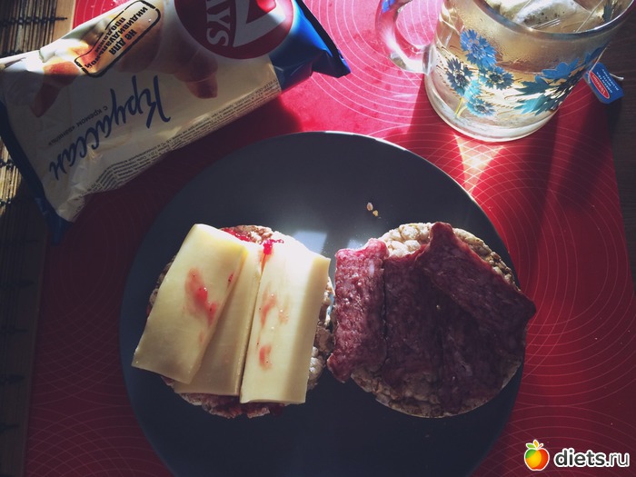 Завтрак был довольно плотный - бутерброд с брусничным соусом и сыром на хлебце, бутерброд с колбасой на хлебце, круассан, кружка зеленого чая.