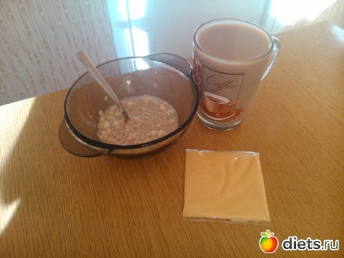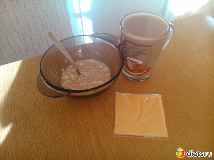 Завтрак - каша, кофе с молоком, сыр...