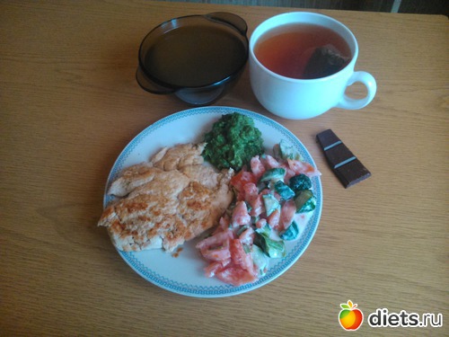 Обед - пюре из брокколи, куриная отбивная, салат из помидор и огурцов (заправила йогуртом), куриный бульон, чай и темный шоколад...