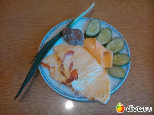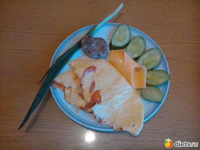 Ужин - омлет с помидором (2 яйца), говяжья котлетка, ломтик сыра, огурчик...