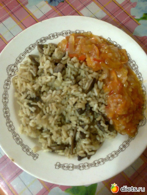 О - рис с обжаренными шампиньонами и лучком на небольшом кол-ве раст.масла, специй подабавила, заправила соевым соусом + 3ст.л. консервированного салата с рисом.
