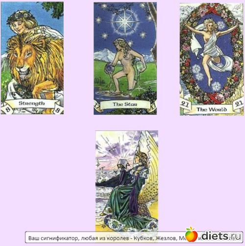 Выбираем 3 старших аркана - Сила, Звезда, Мир, а также придворную карту - свой сигнификатор, одну из королев или если чувствуете себя пажом или рыцарем - вуаля )