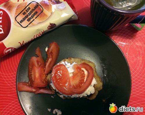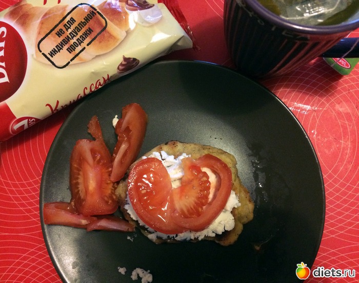 Завтрак - гороховая лепешка с рикоттой и помидором, круассан