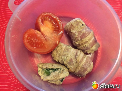 Ланч - 2 куриных рулетика с брокколи в беконе, один рулетик без бекона, помидор