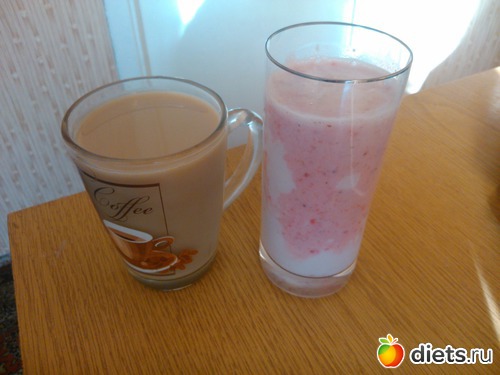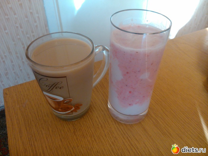 Завтрак - коктейль из натурального йогурта, красной смородины, 1\3 банана и разбавила молоком, кофе с молоком...