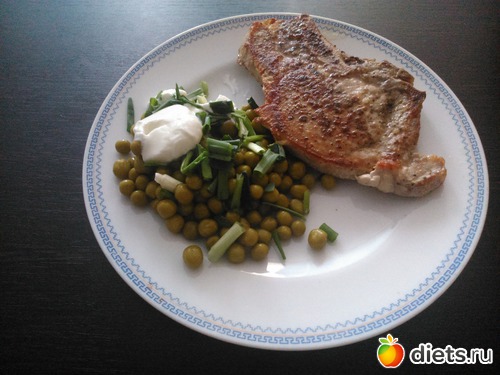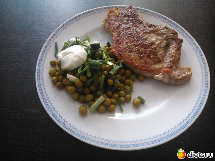 Обед - свиная отбивная (половина куска оказалась кость), зеленый горошек, зеленый лук, натуральный йогурт...
