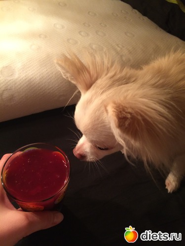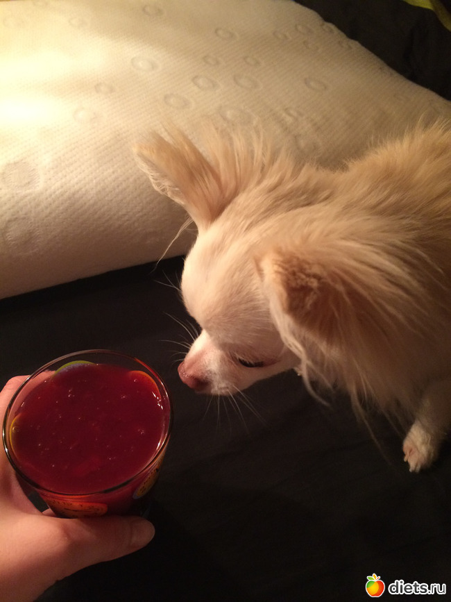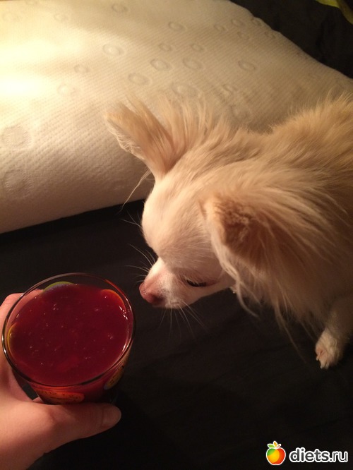 На ночь выпила 284 грамма киселя. Пью иногда на ночь вместо ряженки. Плюс у меня вчера было повышенное давление, после танцев чувствовала себя «очень не очень». А на фото моя собачка) Джой его зовут!